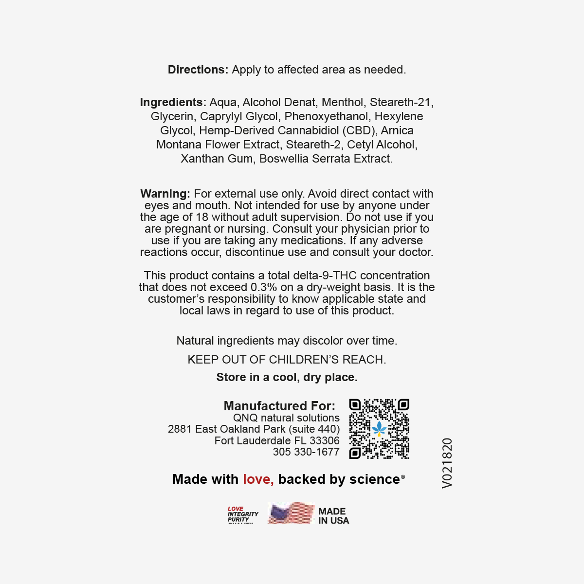 Menthol, Aqua, Alcohol Denat, Steareth-21, Glycerin, Caprylyl Glycol, Phenoxyethanol, Hexylene Glycol, Hemp-Derived Cannabidiol (CBD), Arnica Montana Flower Extract, Steareth-2, Cetyl Alcohol, Xanthan Gum, Boswellia Serrata Extract. Natural ingredients may discolor over time.